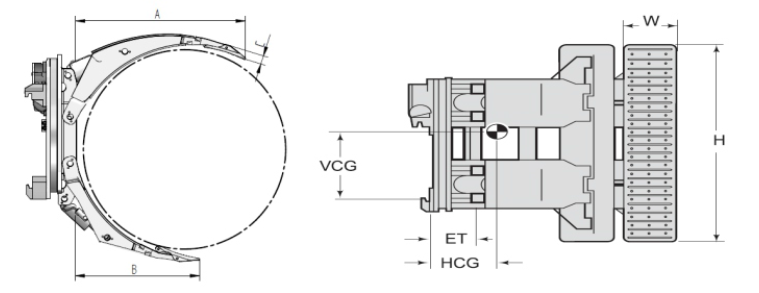 | Capacità | Modello | Classe di montaggio | Gamma di rotoli (mm) | Angolo di montaggio | Lunghezza del braccio lungo (Mm) | Lunghezza del braccio corto (Mm) | Spessore braccio lungo (Mm) | Dimensione tampone di contatto LxA (Mm) | Spessore effettivo (Mm) | Centro di gravità orizzontale (Mm) |
